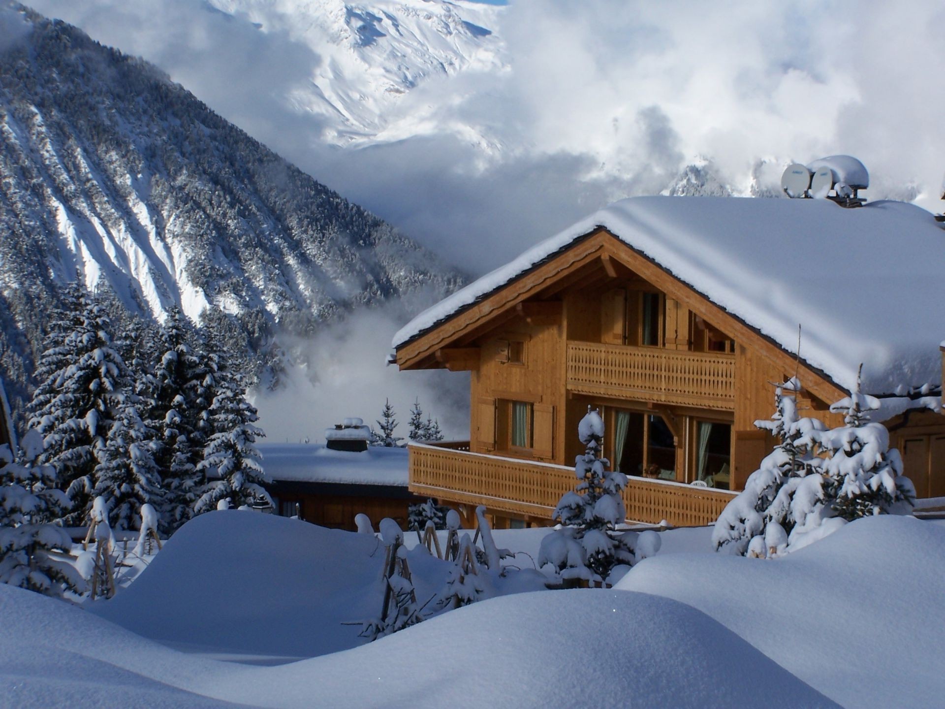 Avalancha de la montaña detrás de la cabaña