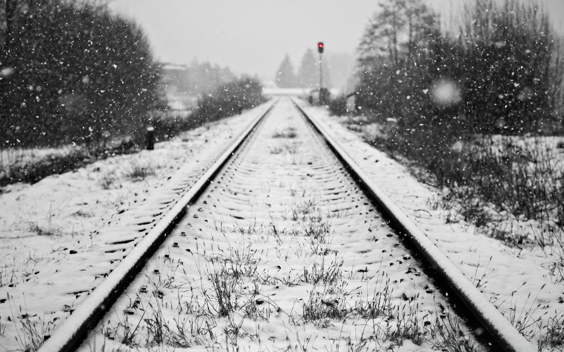 Bolas de Navidad doradas junto a una rama de abeto bajo la nieve que cae