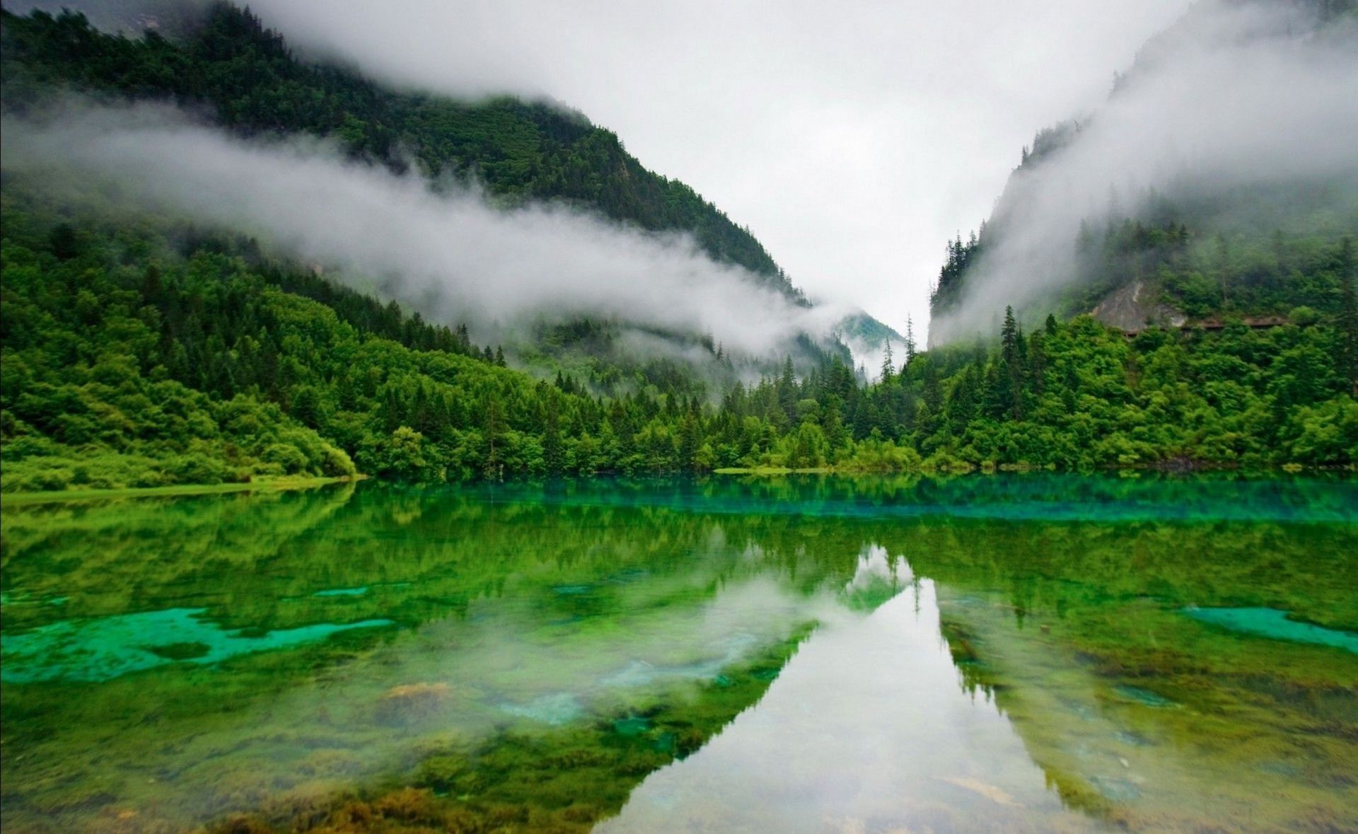 La superficie del espejo del lago refleja el cielo, las cimas de las montañas y los árbolesLa superficie del espejo del lago refleja el cielo, las cimas de las montañas y los árboles