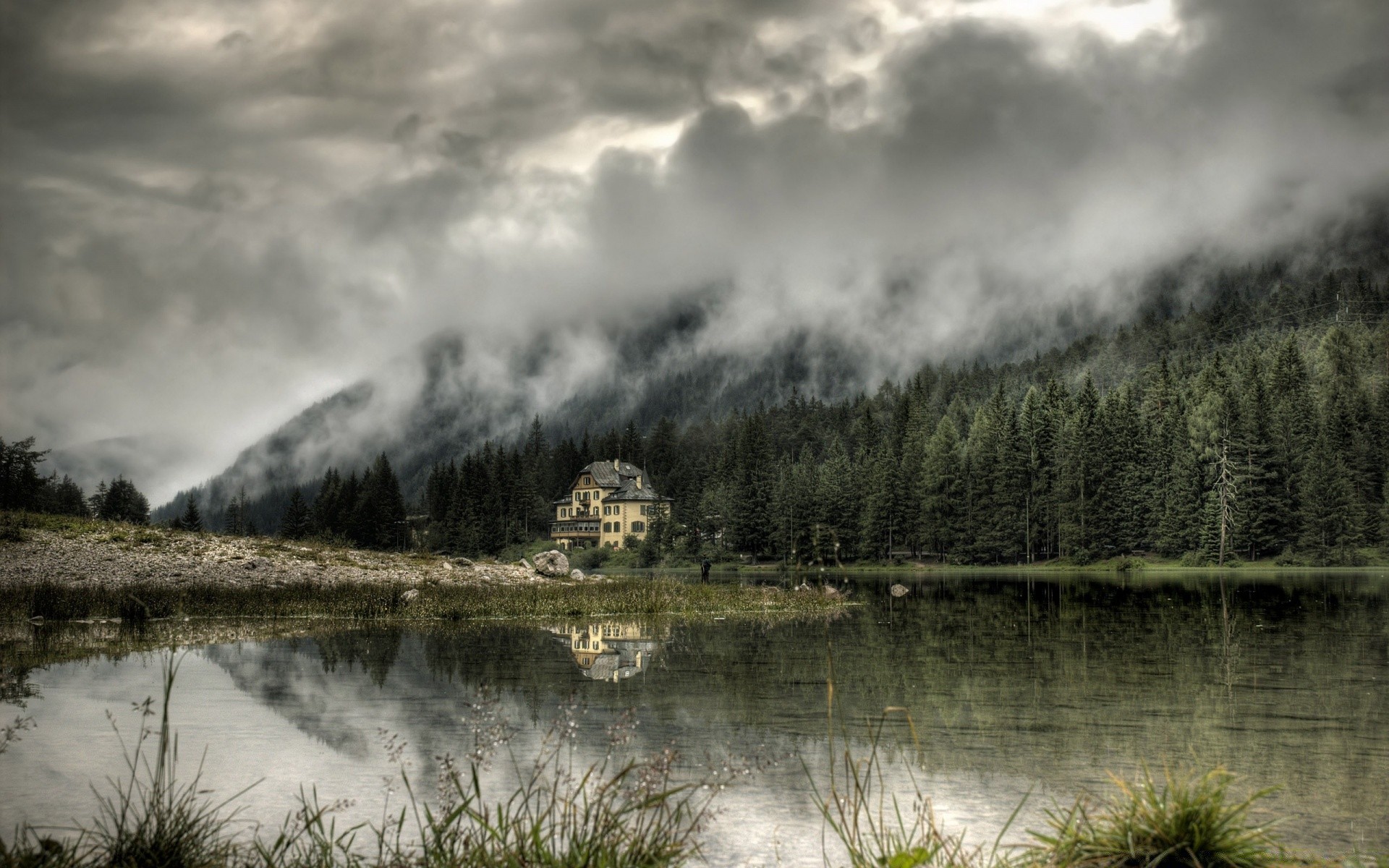 Alrededor del lago hay un bosque de abetos y montañasAlrededor del lago hay un bosque de abetos y montañas