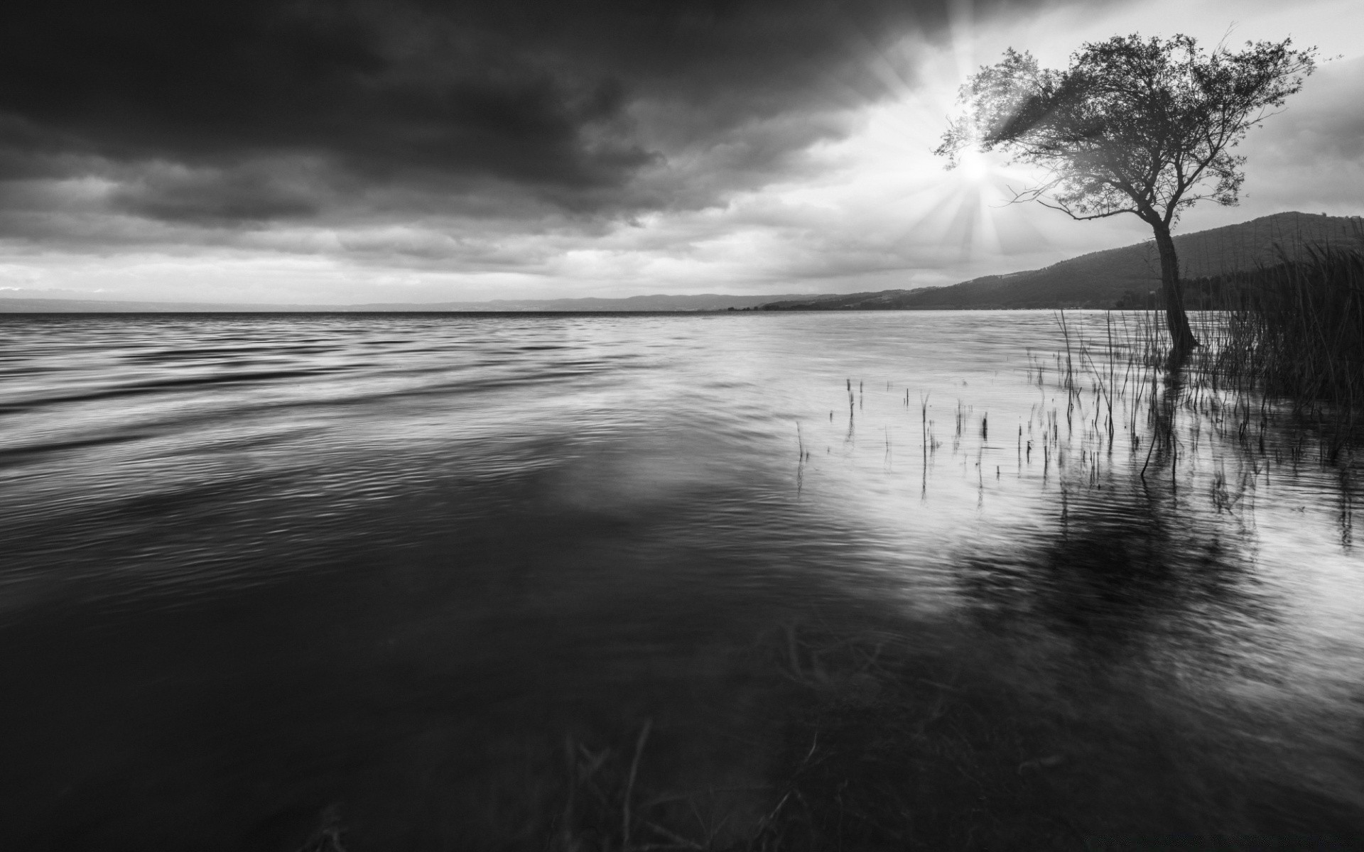 Un árbol solitario cerca de un lago entre las montañas en medio de una puesta de sol