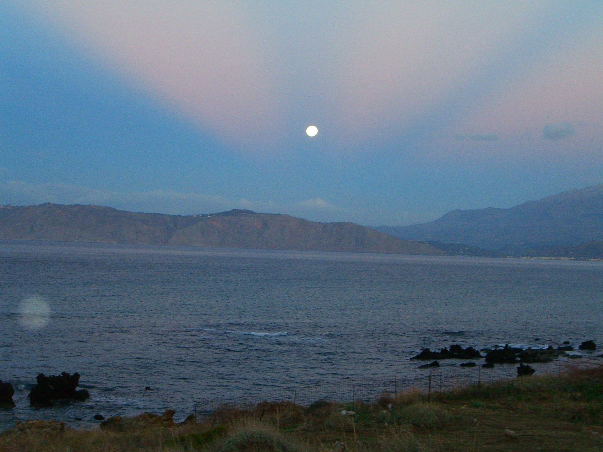 Sol lejano sobre el lago y las montañas