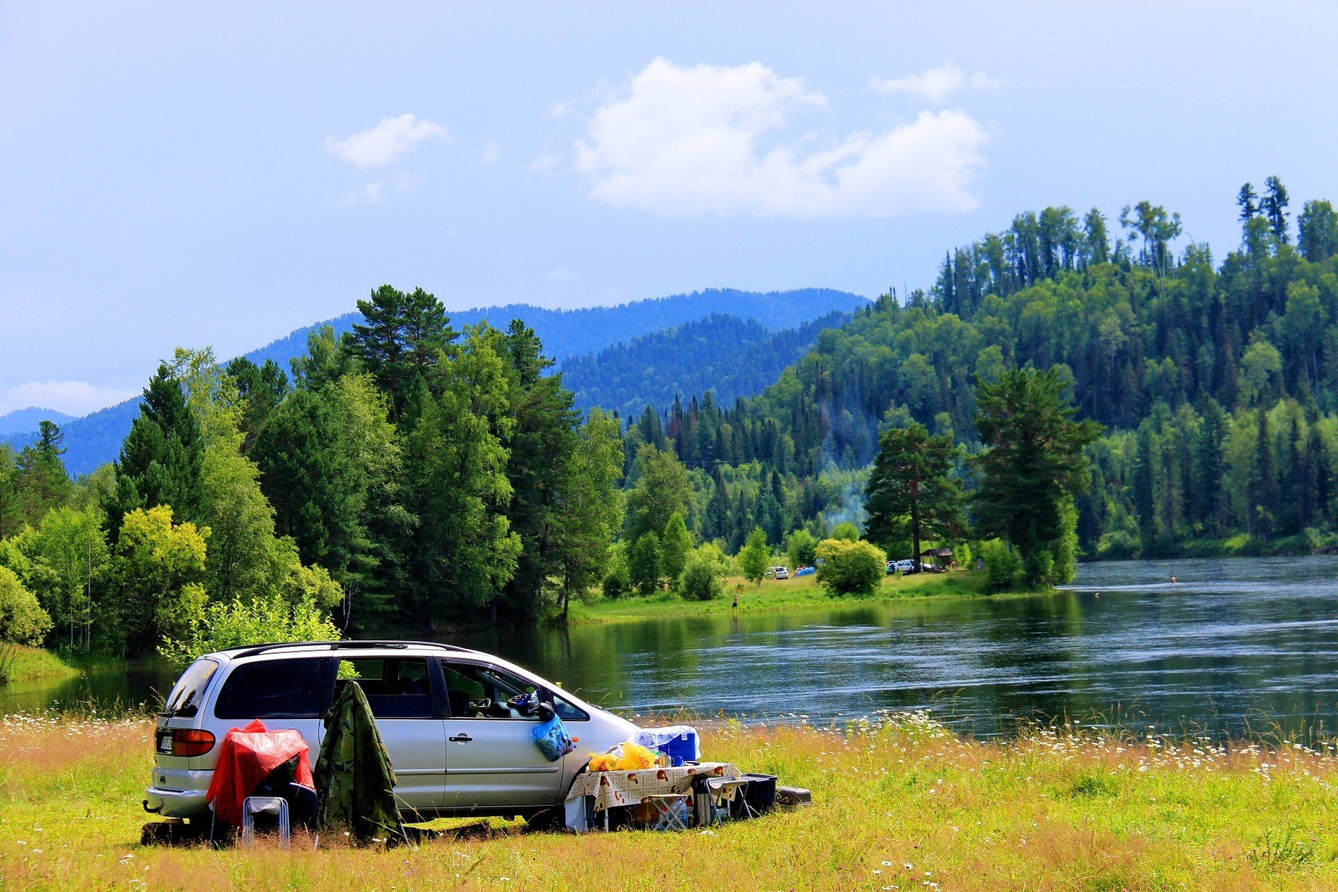 Bosque y lago en el fondo de las montañas y el cielo de la tarde