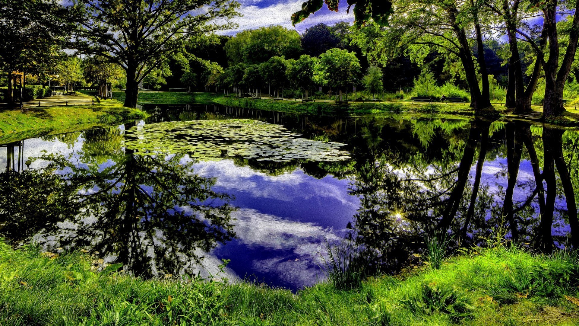 El lago, el reflejo de los árboles en él, el crepúsculoEl lago, el reflejo de los árboles en él, el crepúsculo