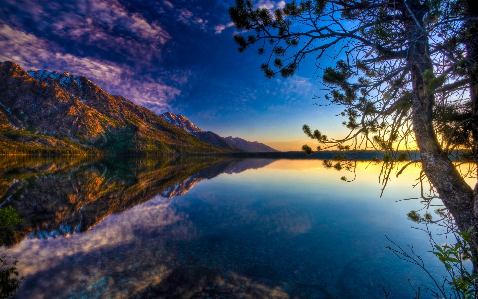 El cielo azul brillante se refleja en la superficie del lago en medio del bosque