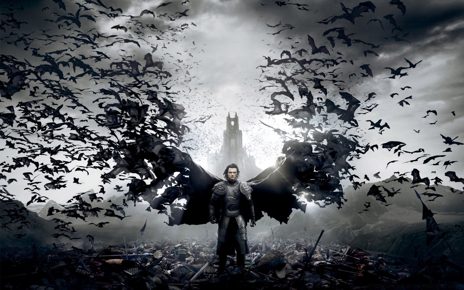 Vanhelsing saliendo del castillo rodeado de murciélagos