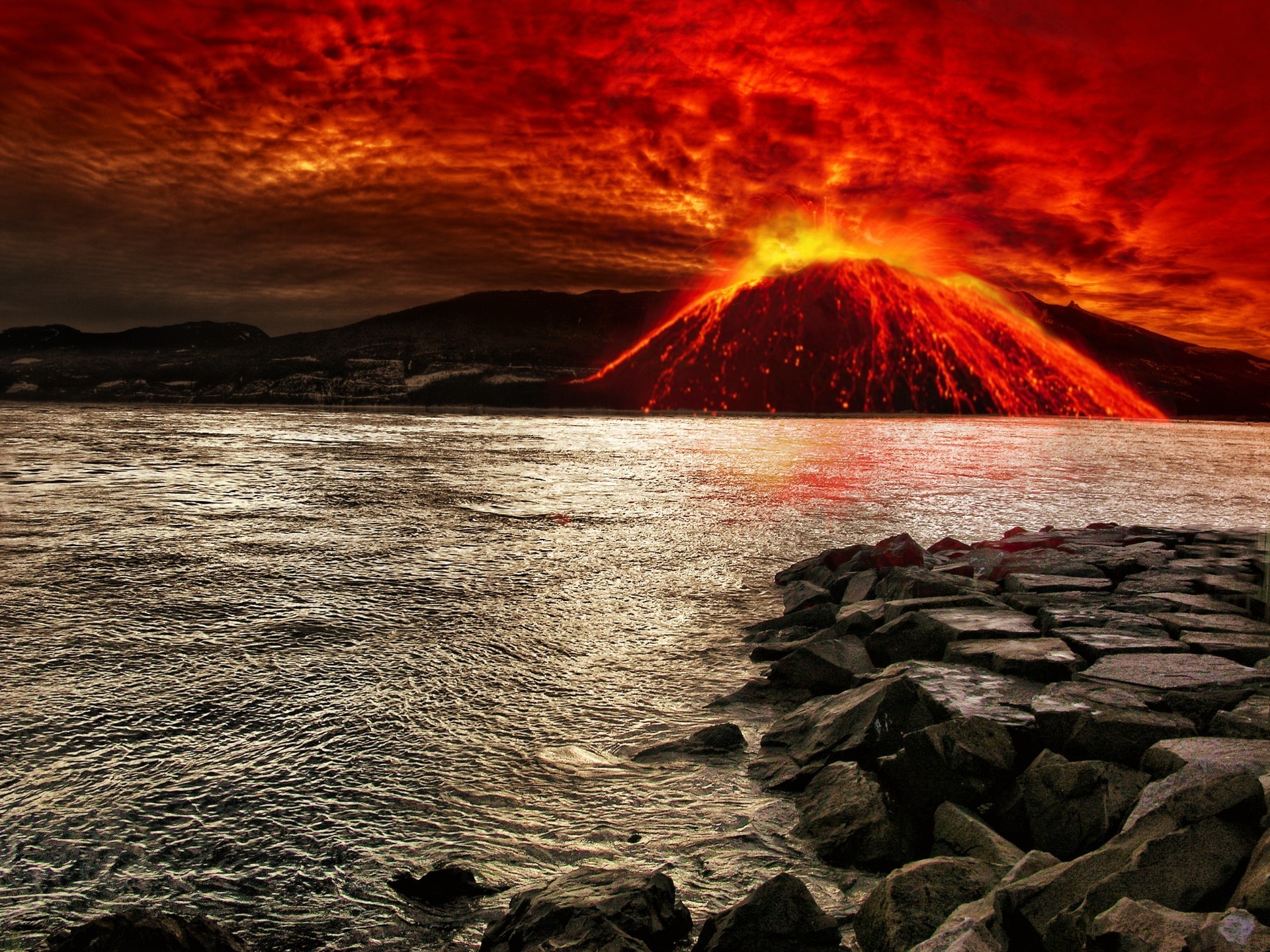 Erupción volcánica en el fondo del océano y las rocas