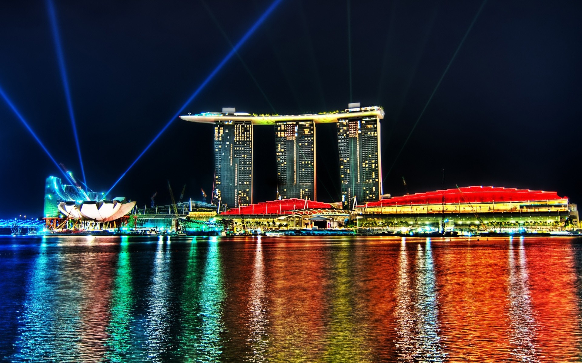 Los árboles amarillos de las montañas de fondo se reflejan en el agua