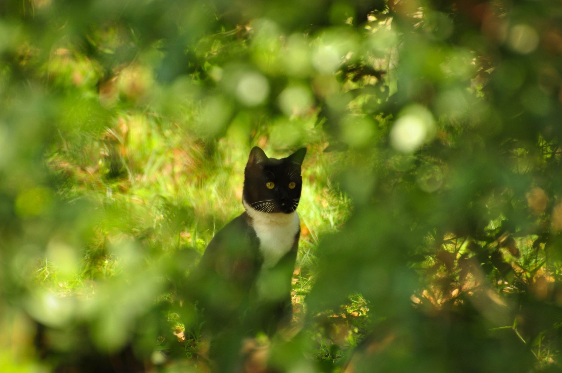 Lindo gato escondido en los arbustos