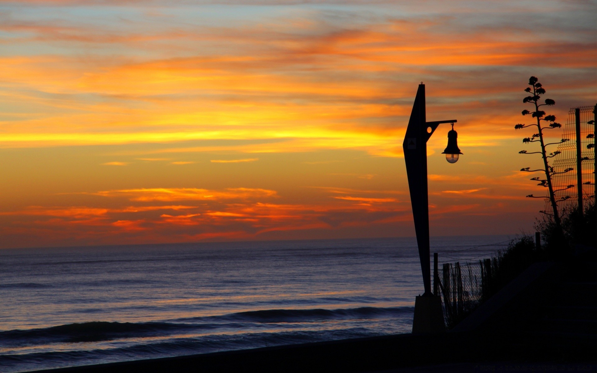 Linterna solitaria en el paseo marítimo después de la puesta del sol silueta de un árbol contra un fondo de color púrpura cruzadoLinterna solitaria en el paseo marítimo después de la puesta del sol silueta de un árbol contra un fondo de color púrpura cruzado