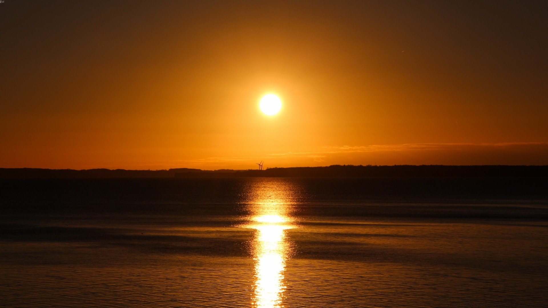 Puesta de sol de color rojo brillante junto al aguaPuesta de sol de color rojo brillante junto al agua