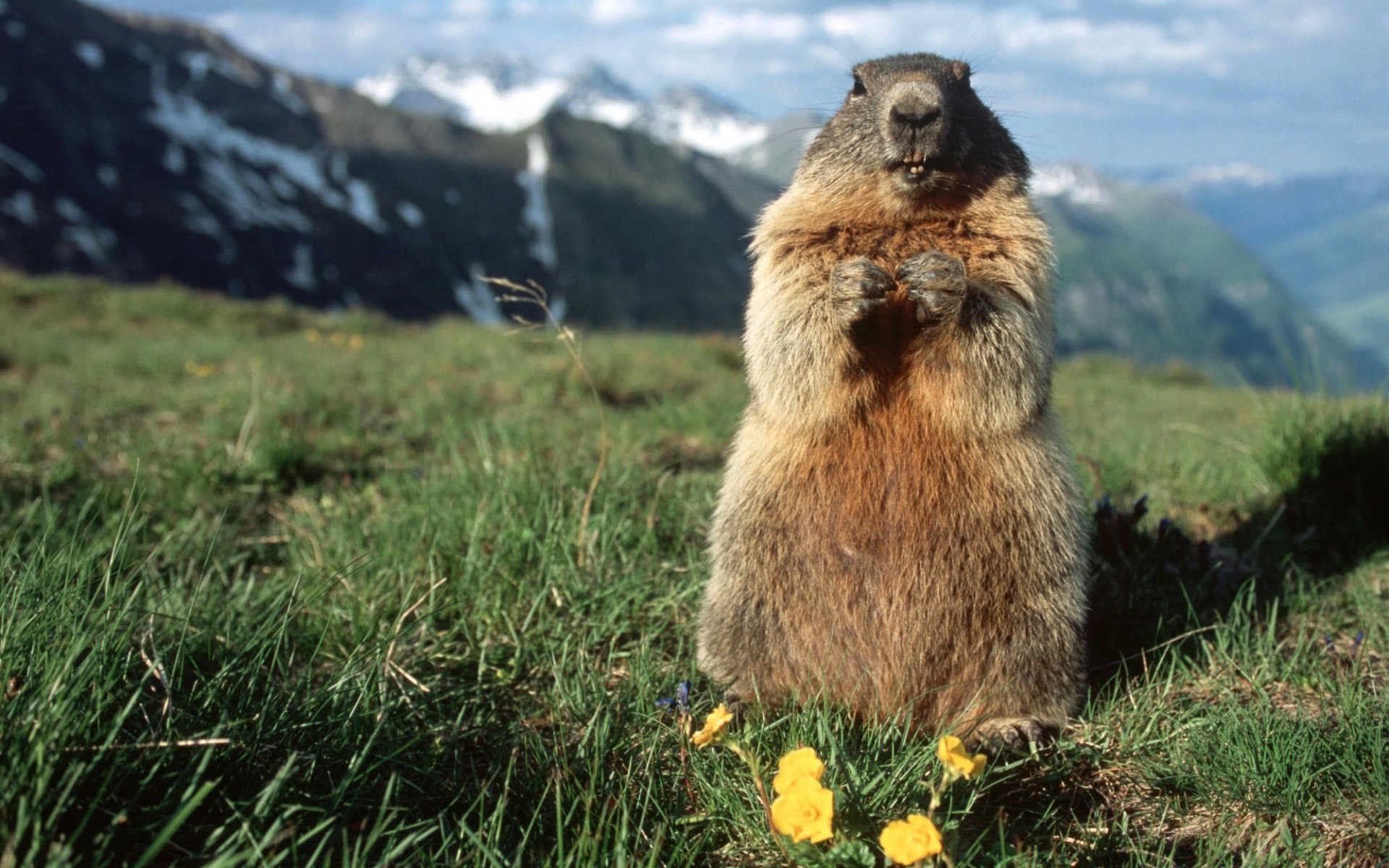 Marmota sorprendida en un campo verde