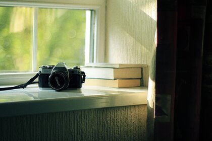 Cámara en el alféizar de la ventana cerca de los librosCámara en el alféizar de la ventana cerca de los libros