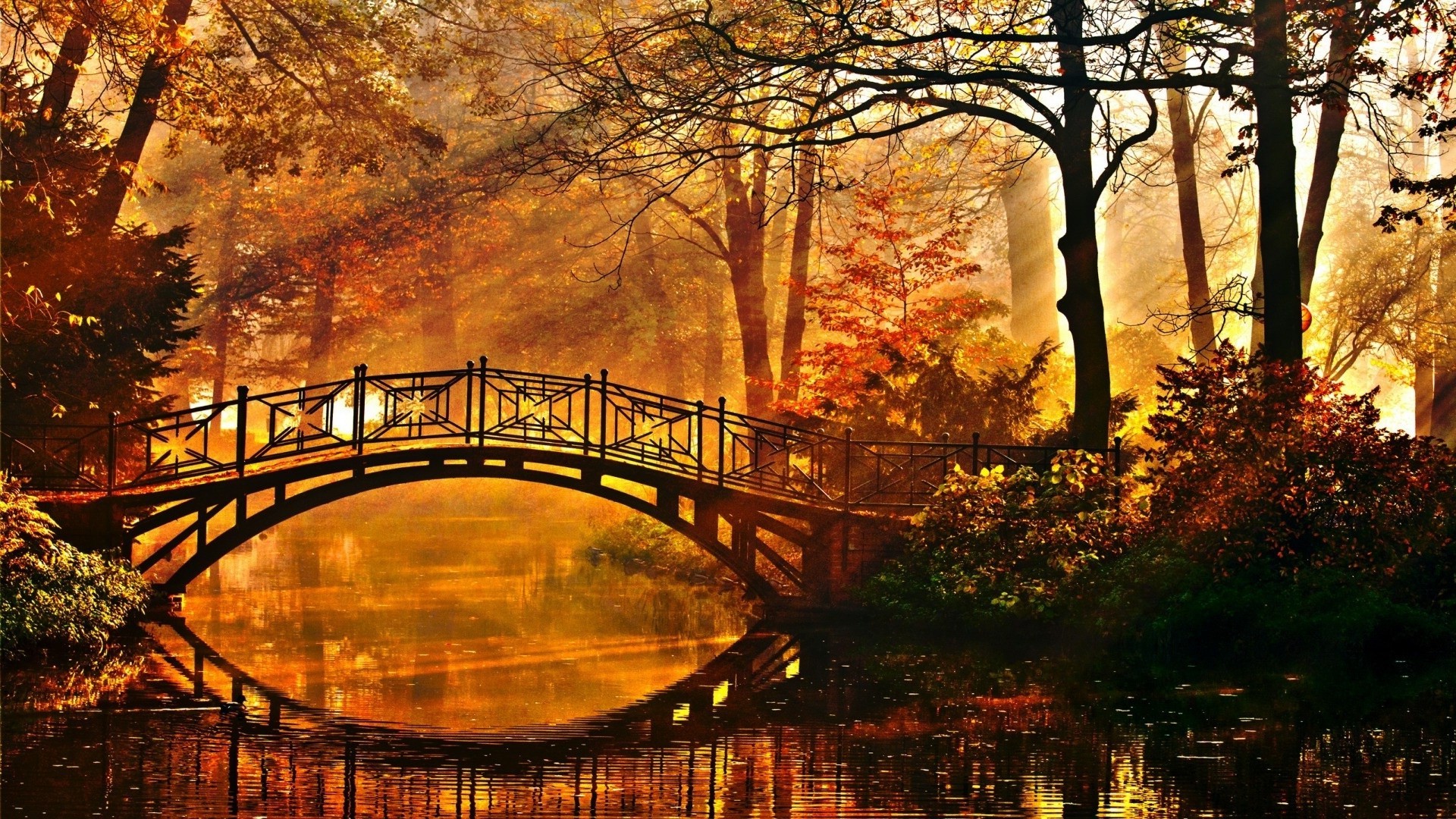 Hermoso estanque en el fondo de una puesta de sol de otoño entre los árboles