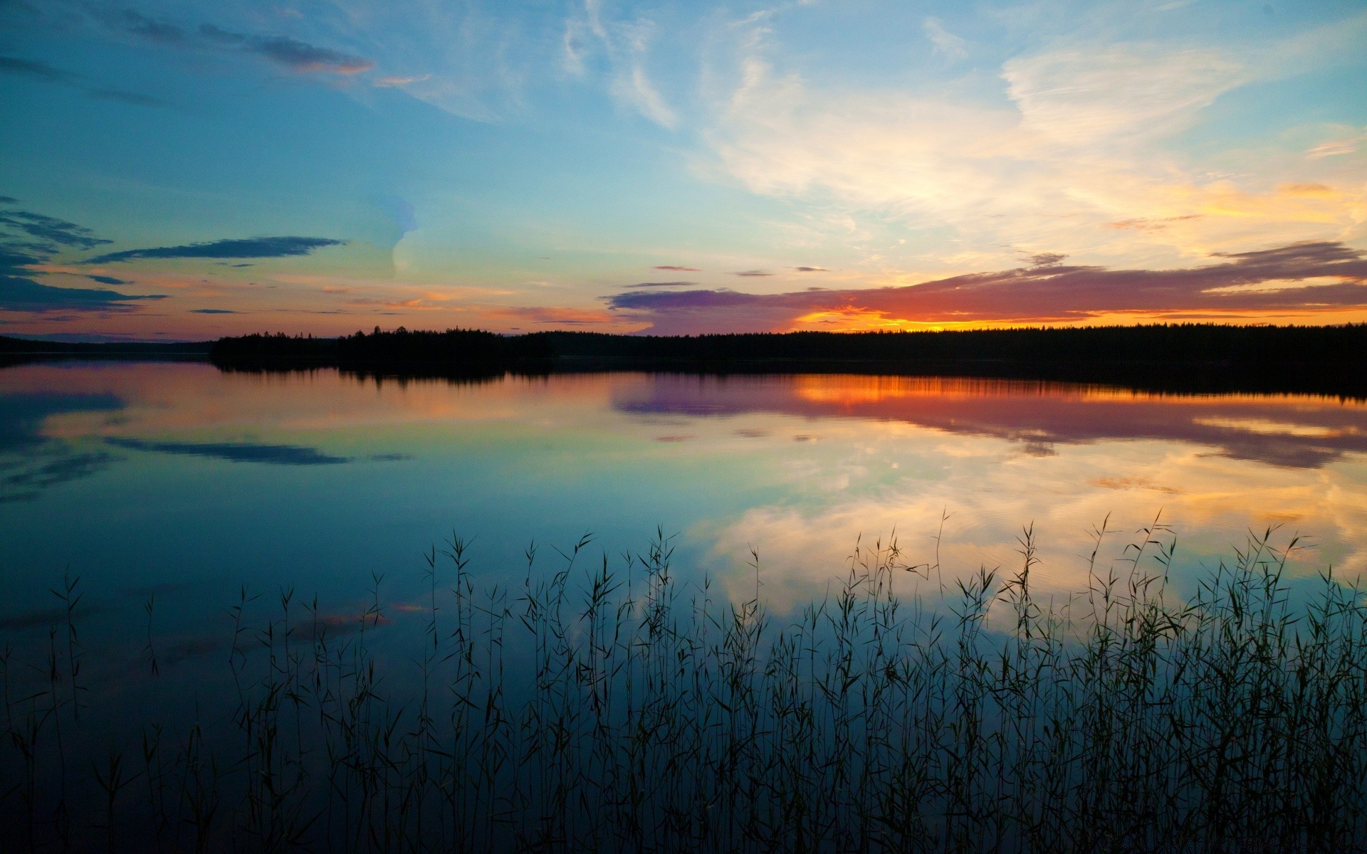 Hermosa puesta de sol en el fondo de las montañas y el agua