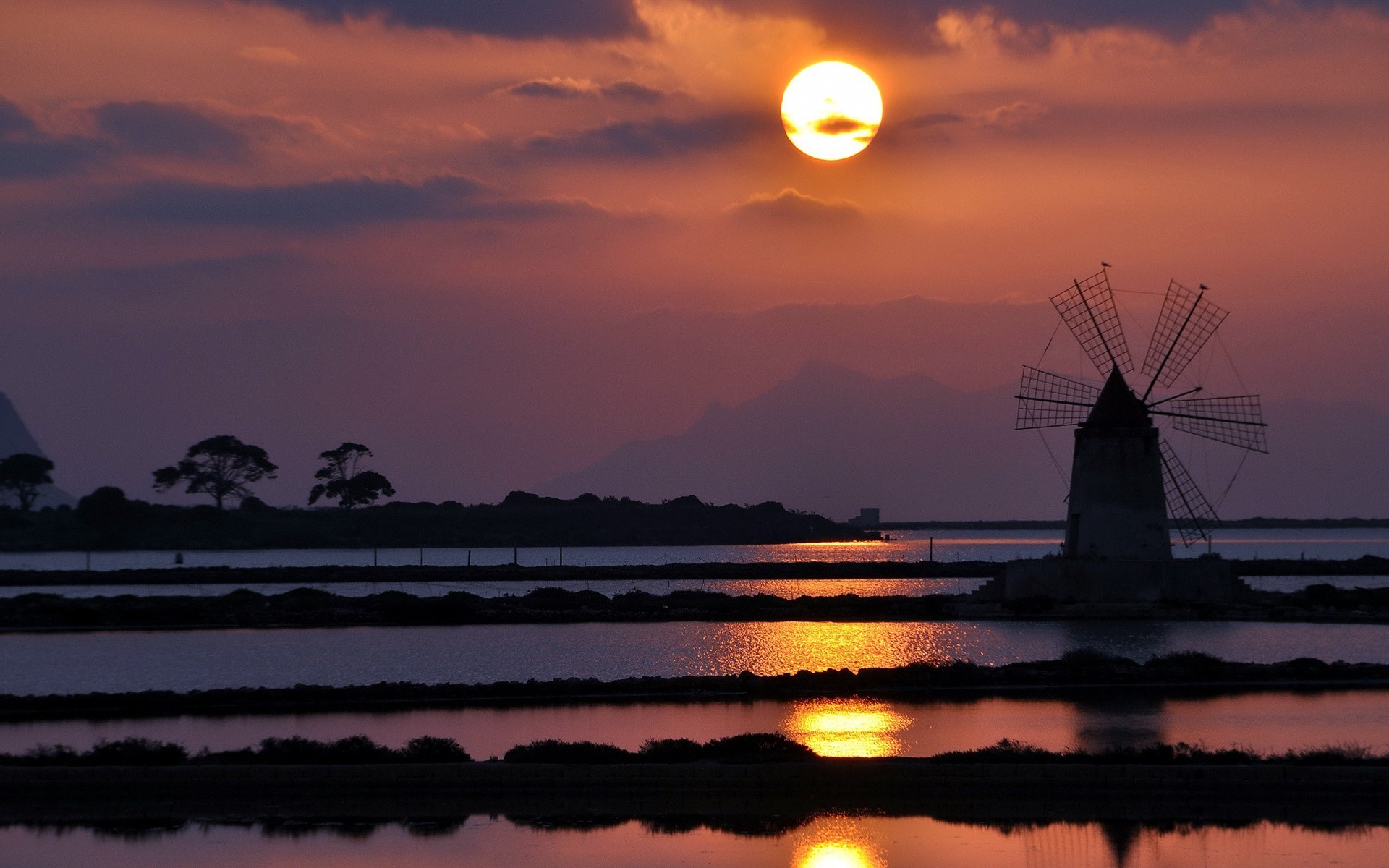 Puesta de sol de invierno con el reflejo del sol en el agua