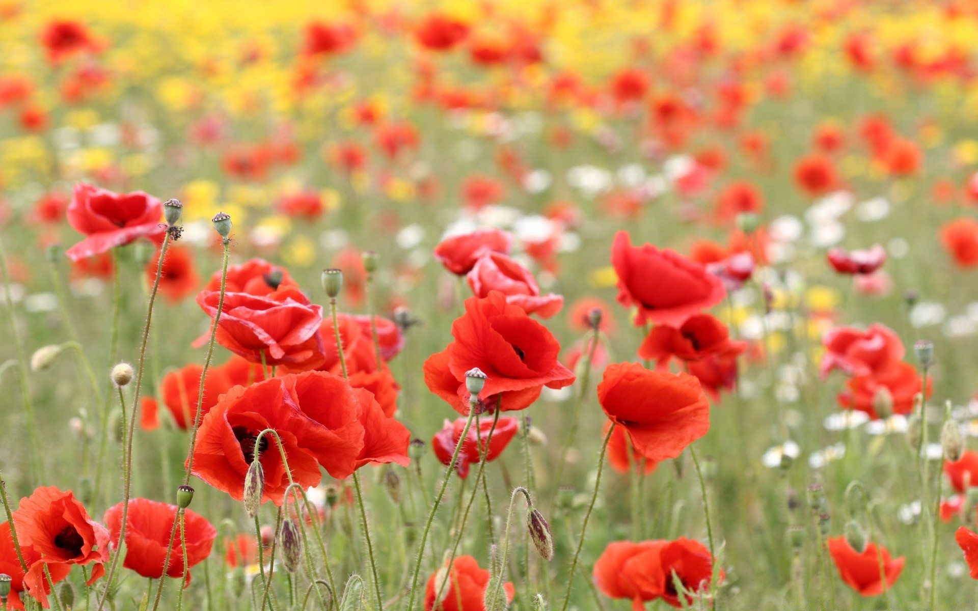 Campo de amapola en los rayos del sol