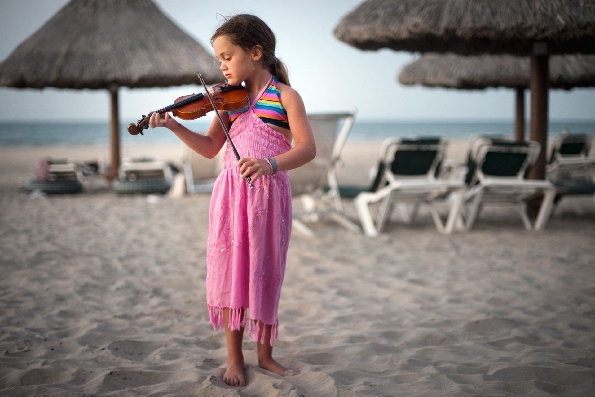 Chica con violín en la playa
