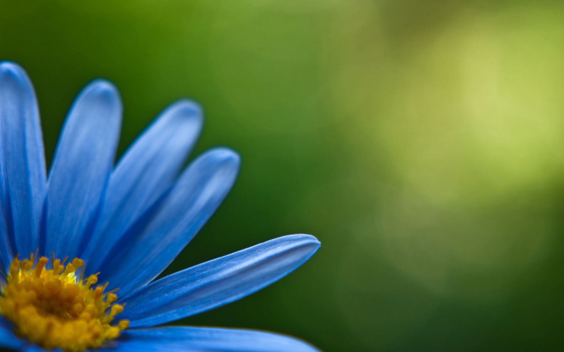 Parte de una flor de manzanilla en tonos azules sobre un fondo verde