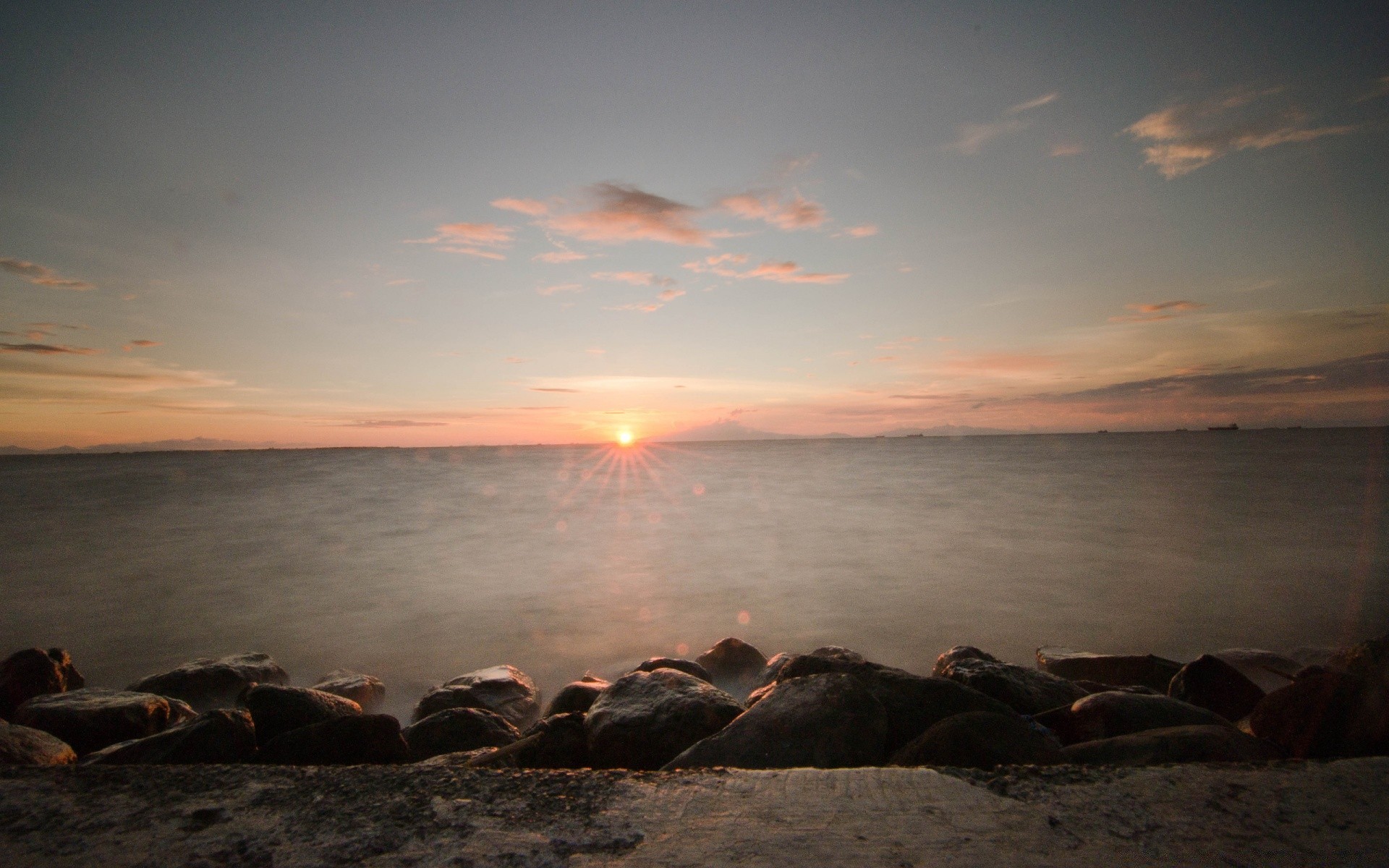 El viajero junto al mar está iluminado por los tenues rayos del sol detrás de la montaña