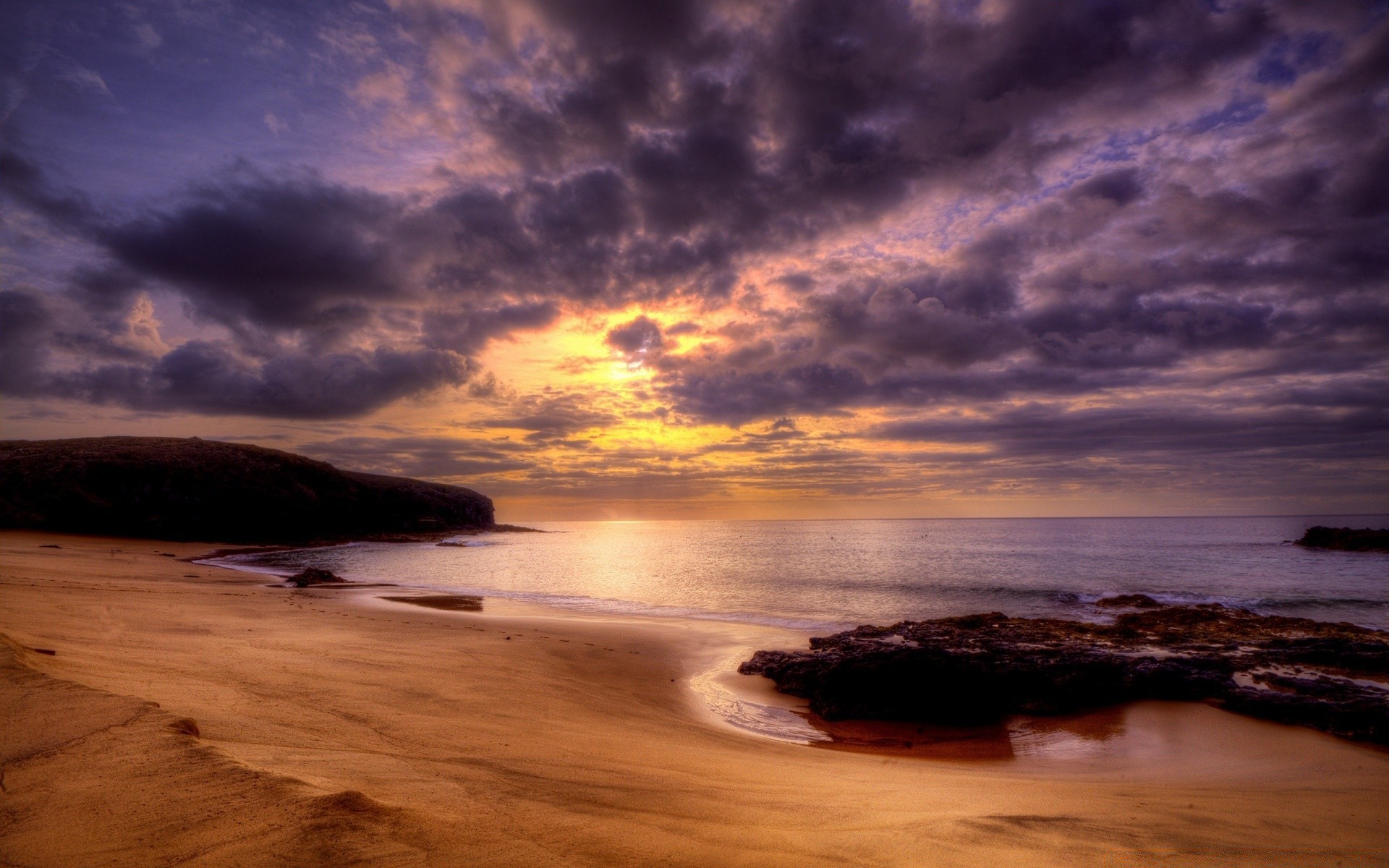 Puesta de sol púrpura y playa