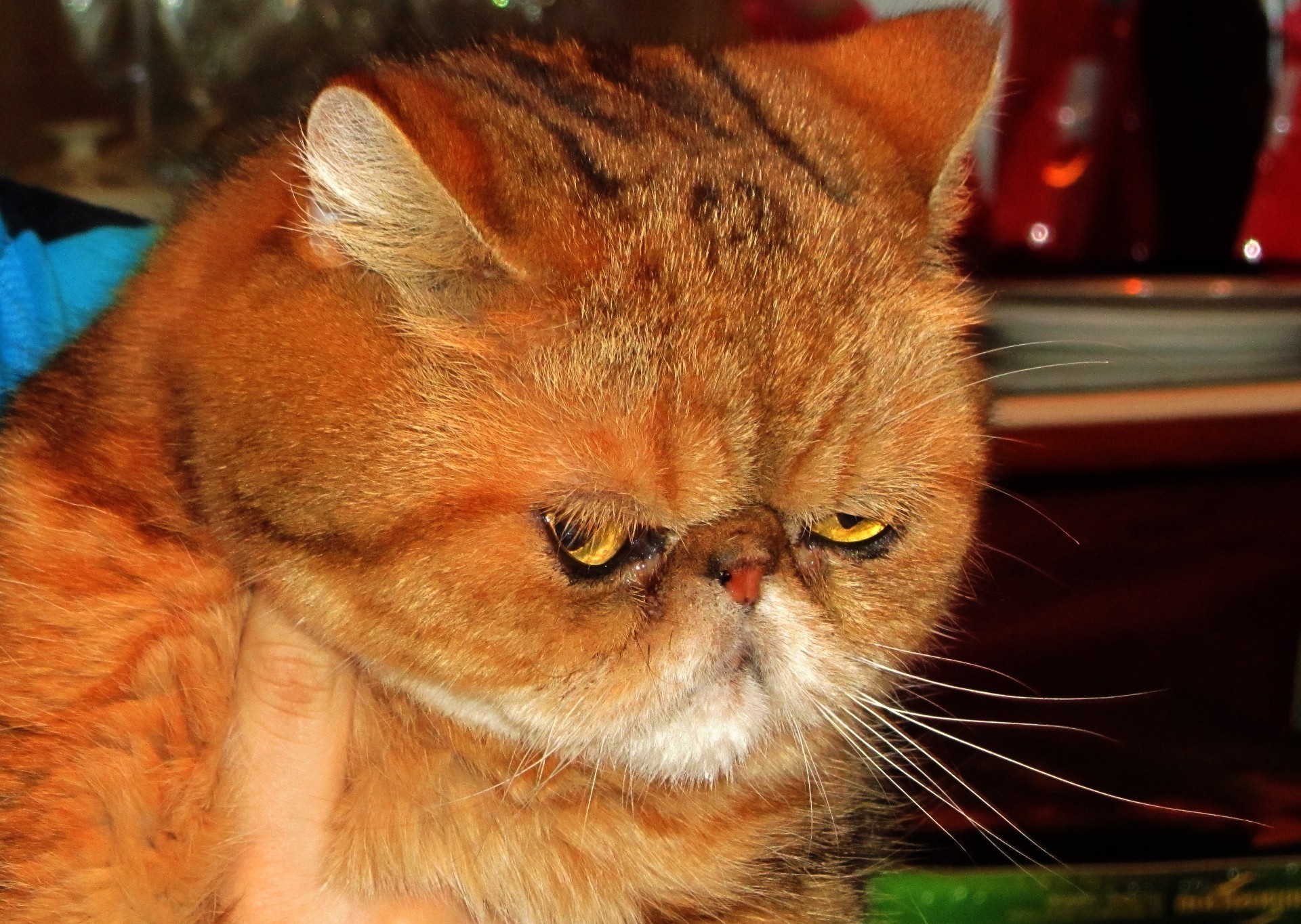 Gato rojo triste en manos de un hombre en un entorno doméstico