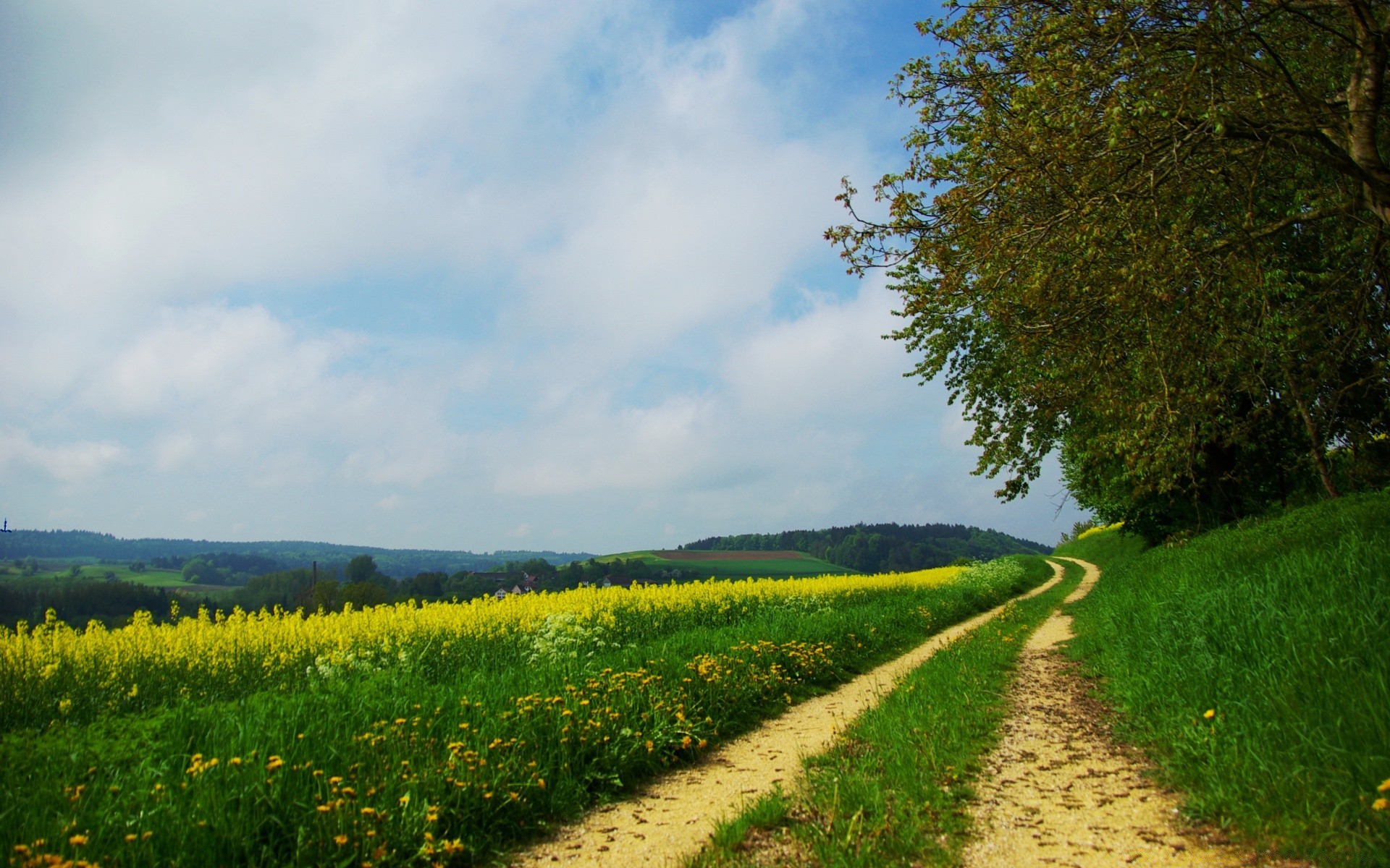 Camino del bosque en medio del cielo azul y la naturaleza verde