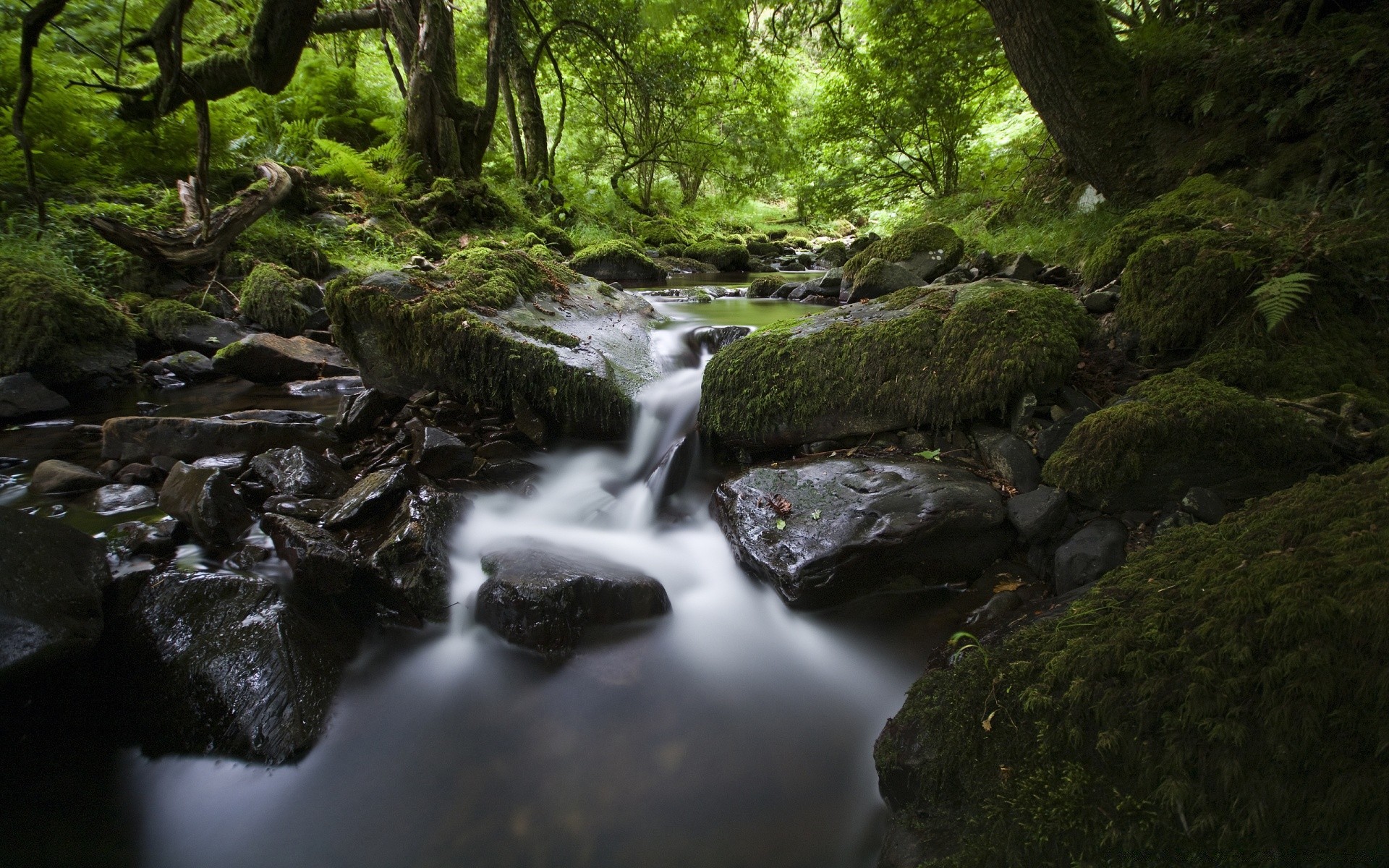 Árboles de Navidad decorados en el bosque en medio de colinas oscuras