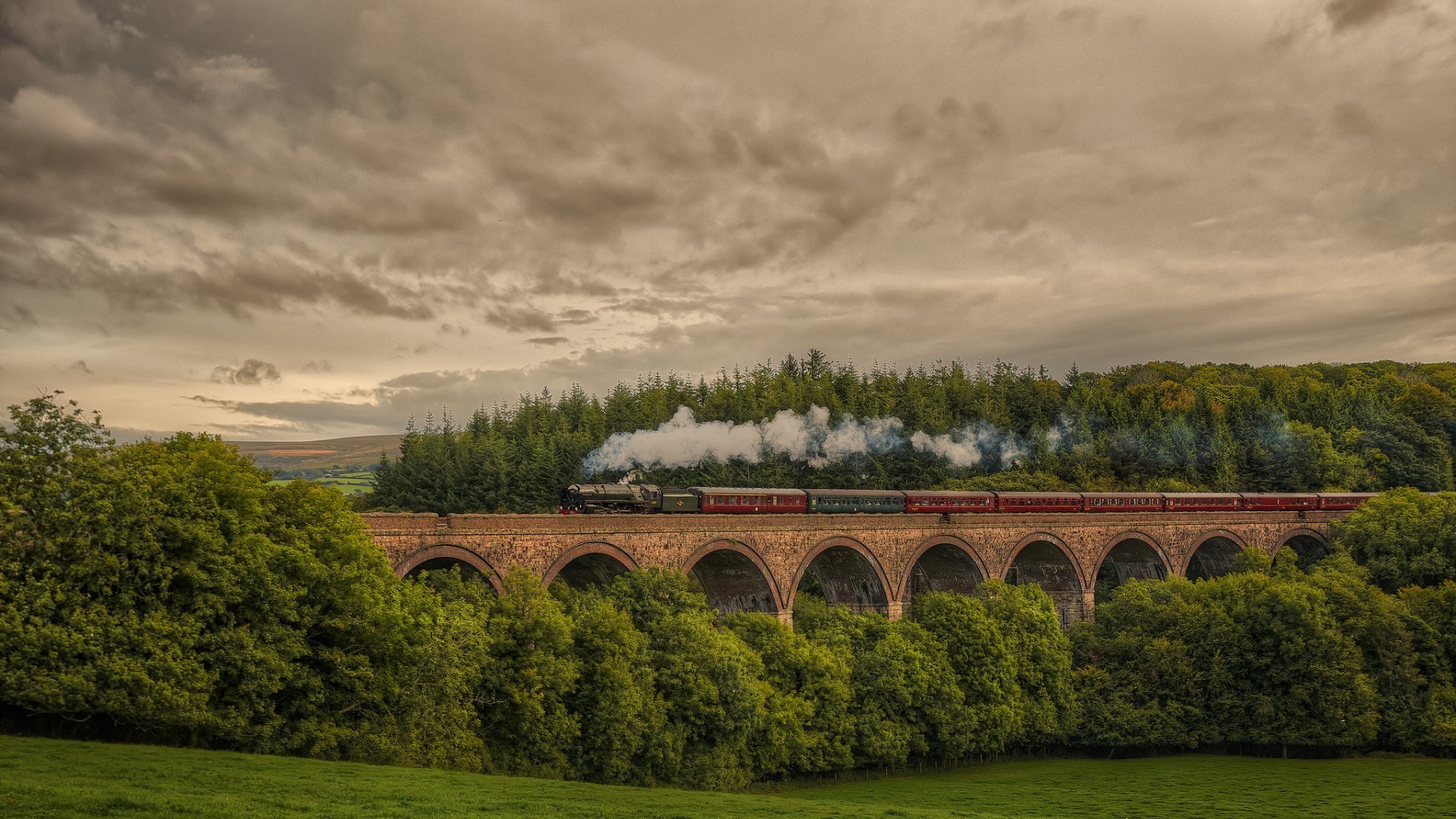 La locomotora se mueve por un puente en medio de colinas verdesLa locomotora se mueve por un puente en medio de colinas verdes