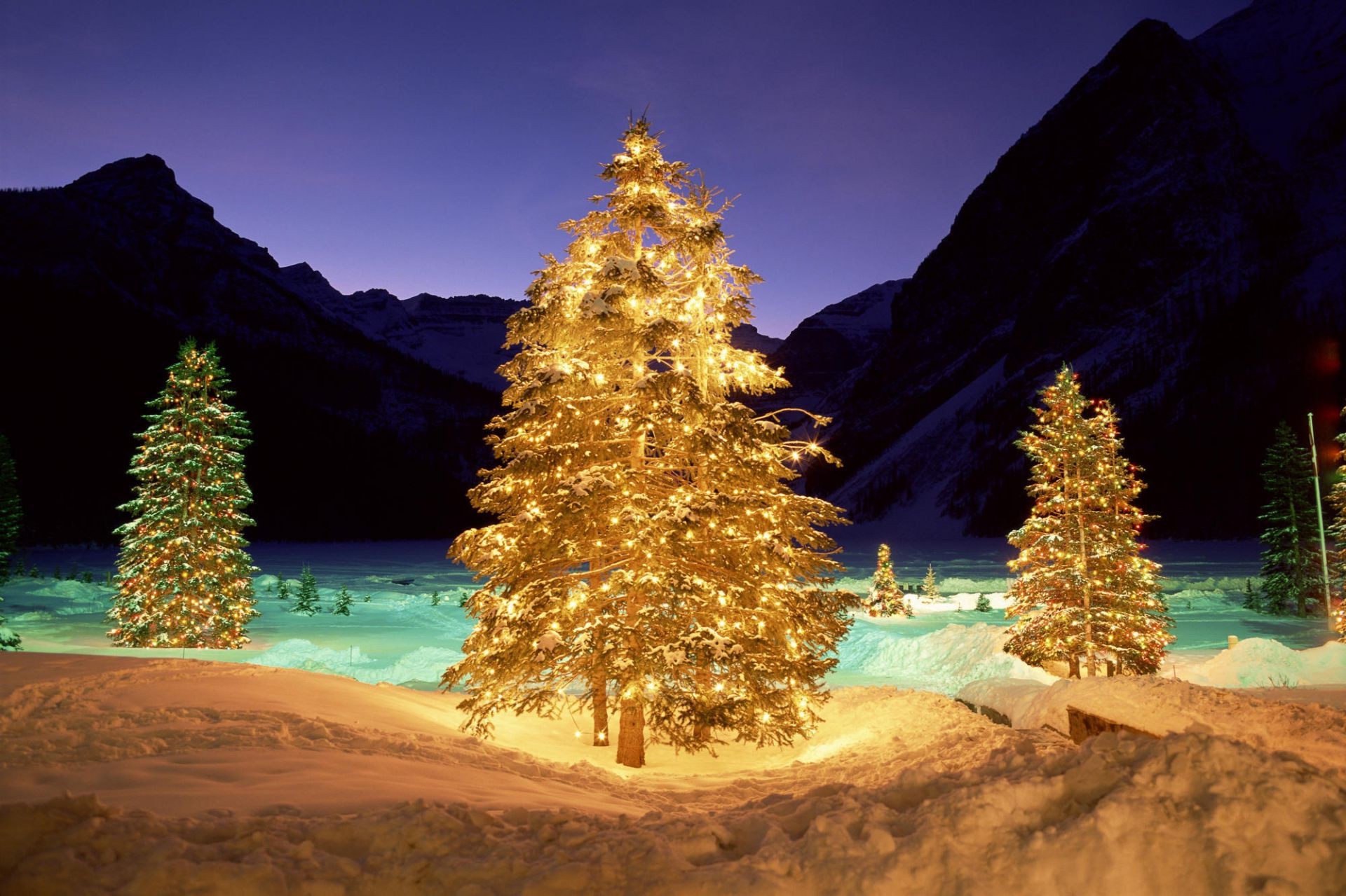 Árboles de Navidad decorados en el bosque en medio de colinas oscuras