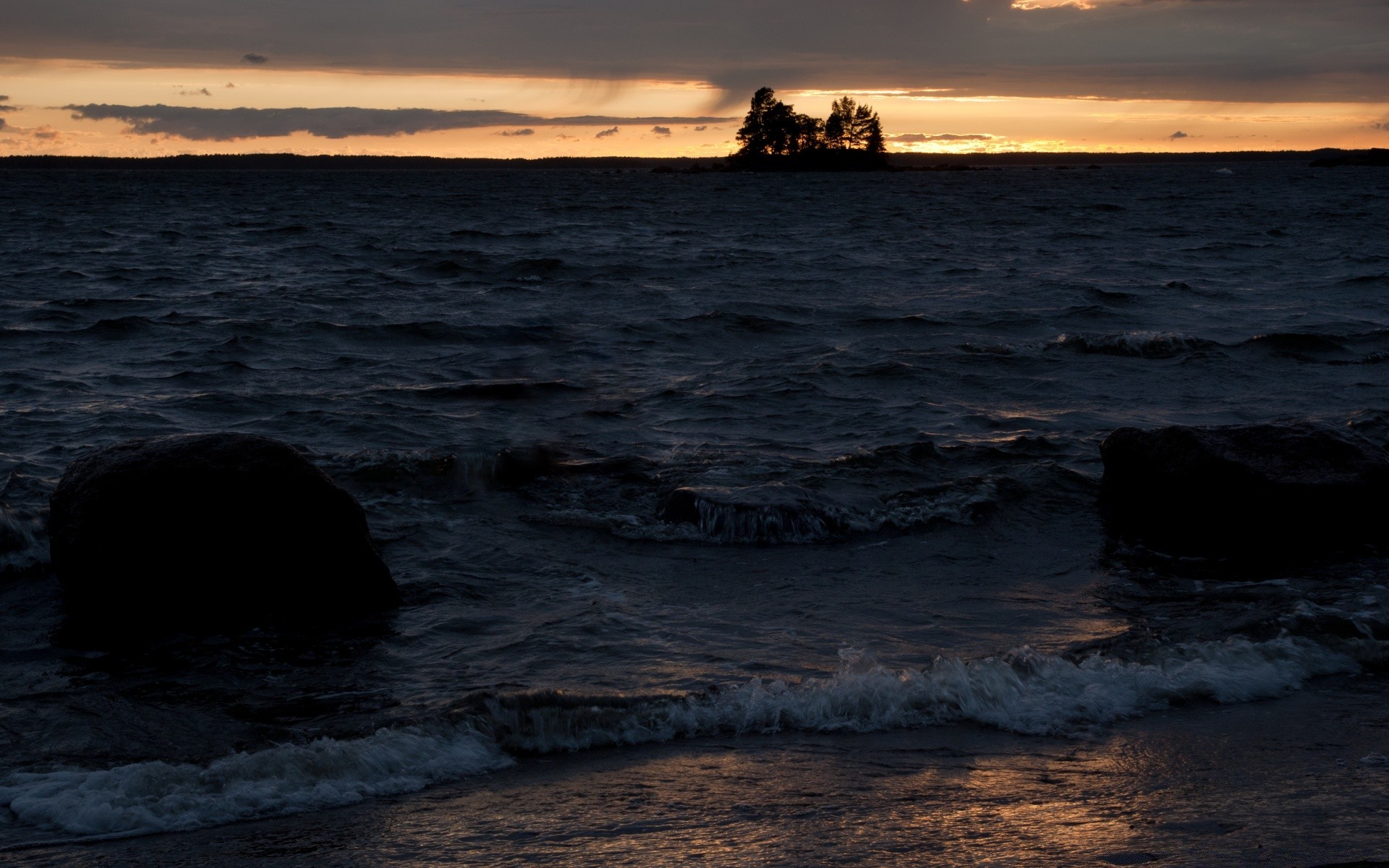 Mar inquieto en medio de un par de árboles y nubes