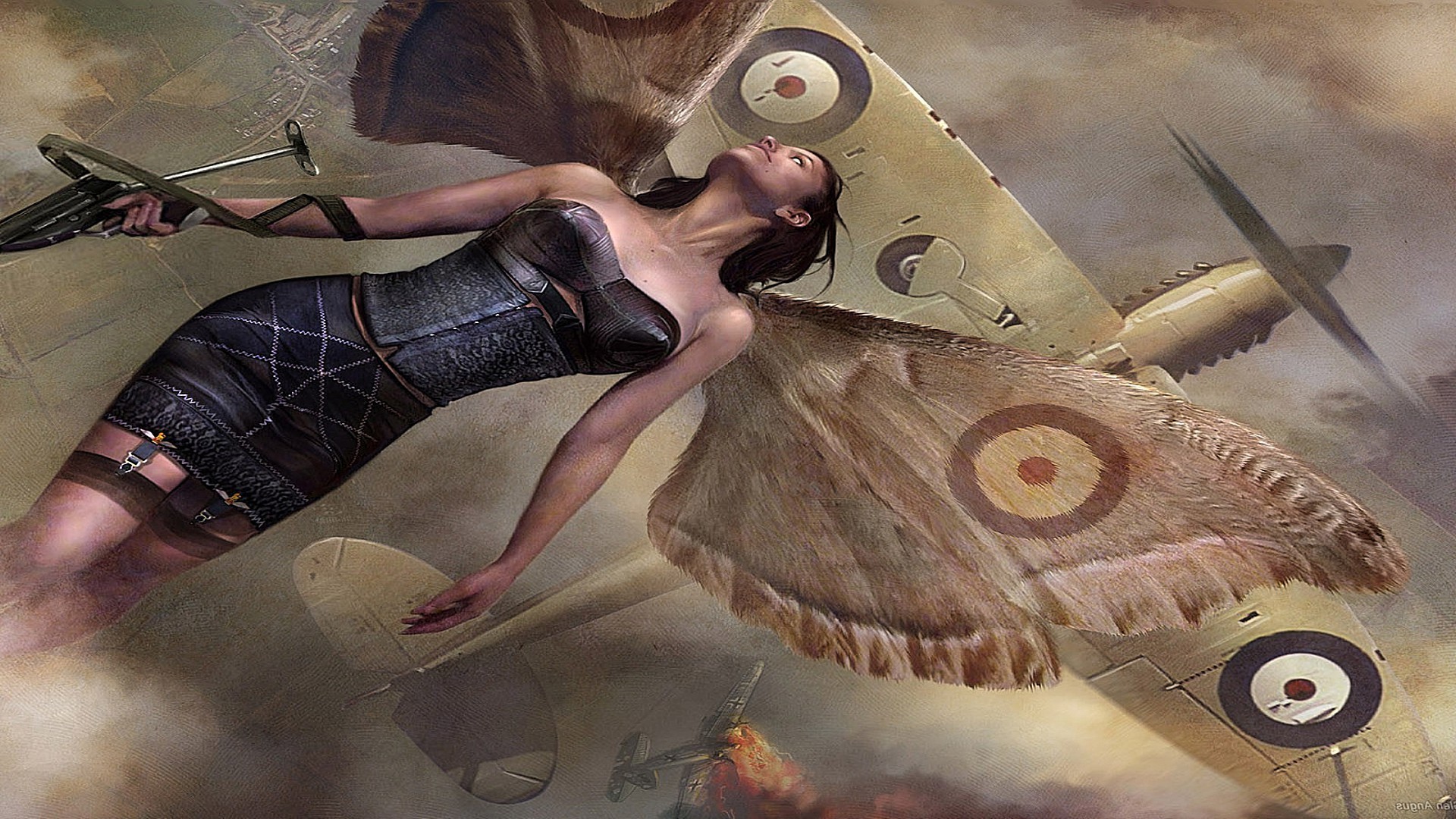 Chica con alas bajo un avión militar