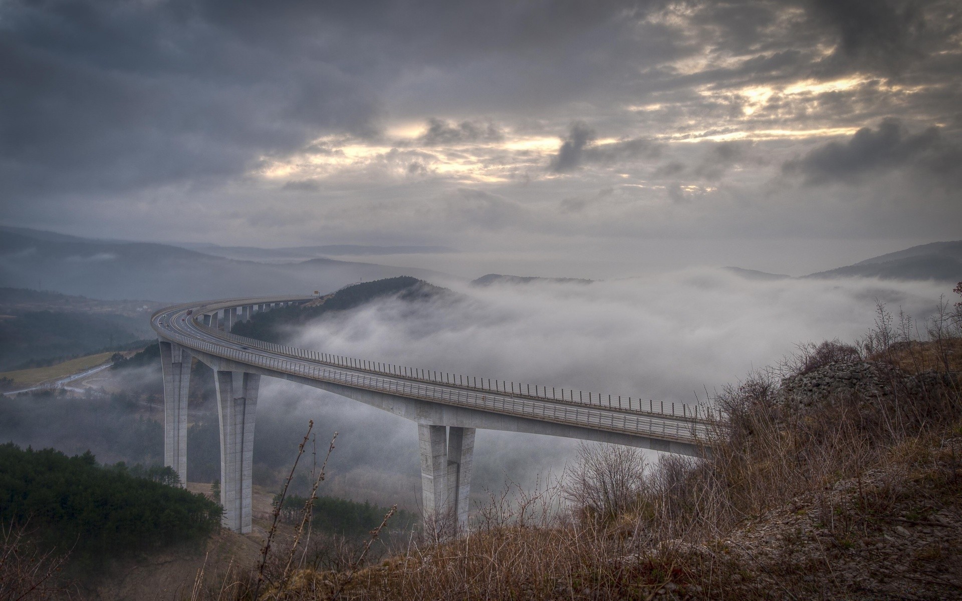 Camino asfaltado que se adentra en el bosque de nieblaCamino asfaltado que se adentra en el bosque de niebla