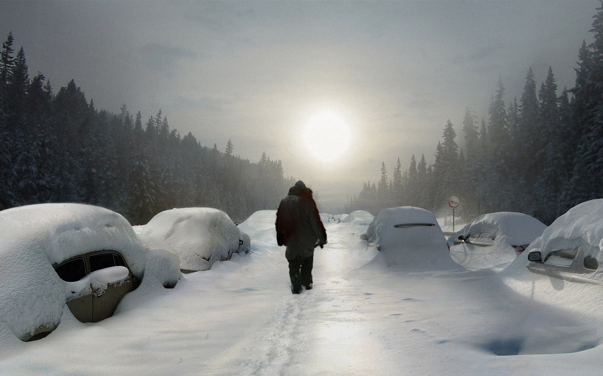Hombre en el camino de invierno hacia el sol