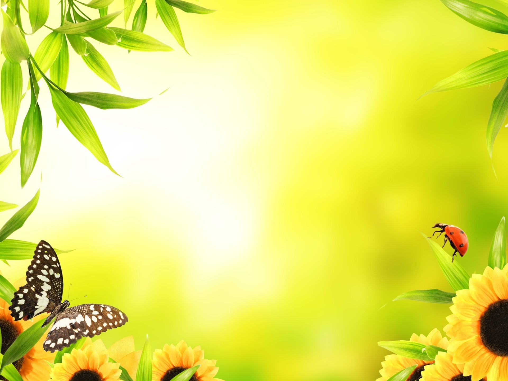 Mariposa y mariquita en girasoles