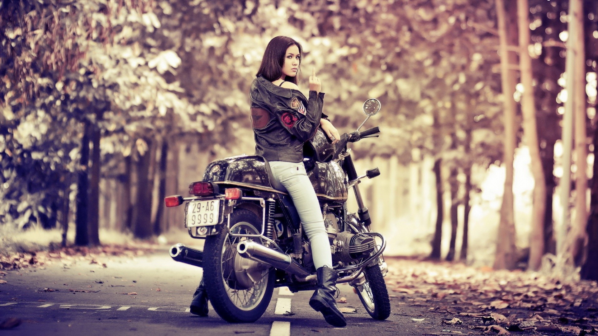 Chica joven en una motocicleta en el bosque