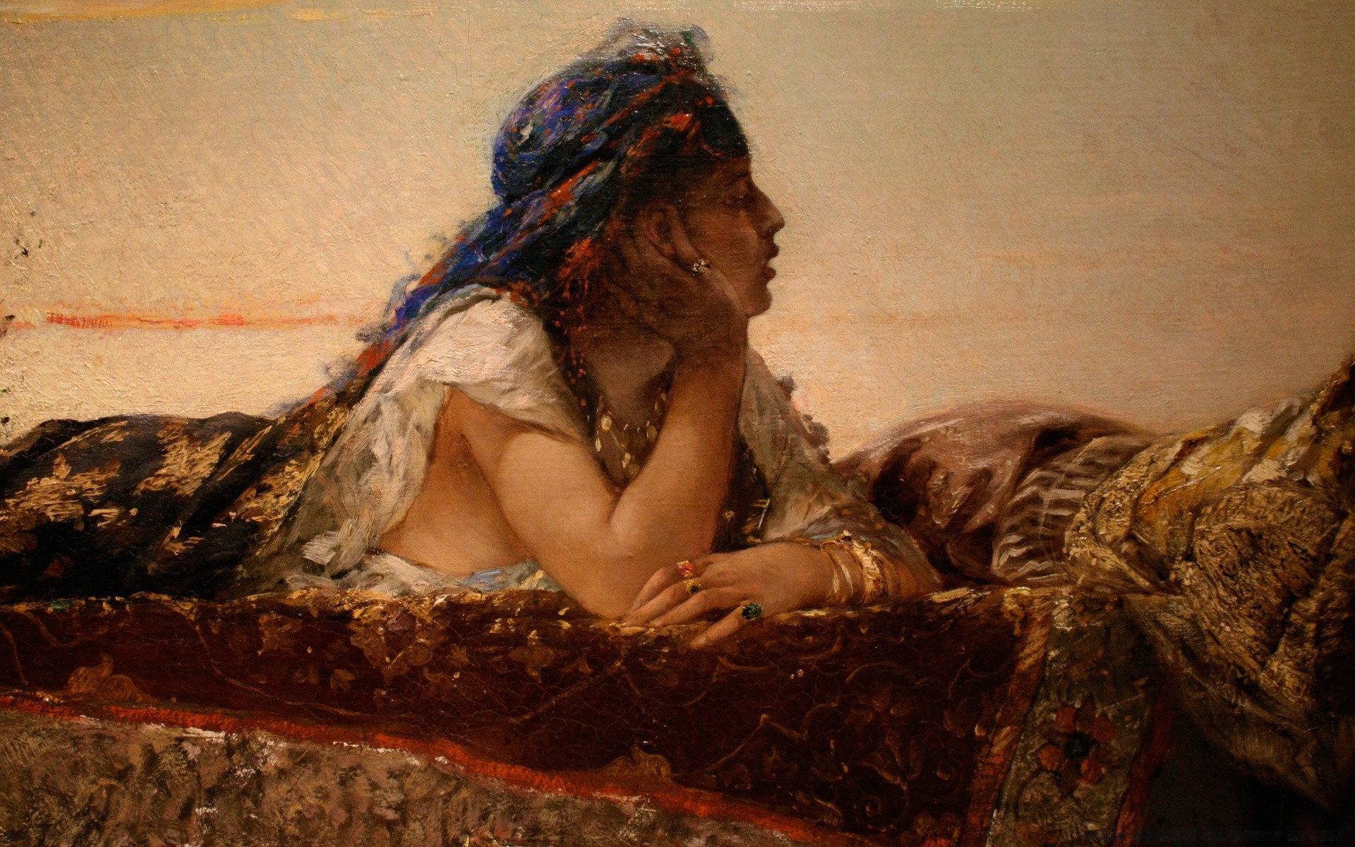 Mujer con pañuelo yace en la alfombra