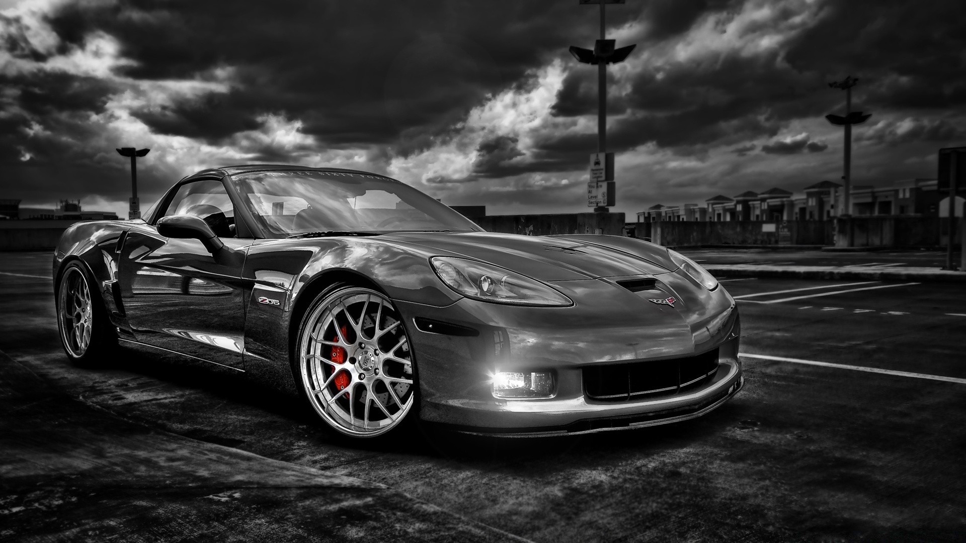 Coche blanco en el fondo de la ciudad de la puesta del sol