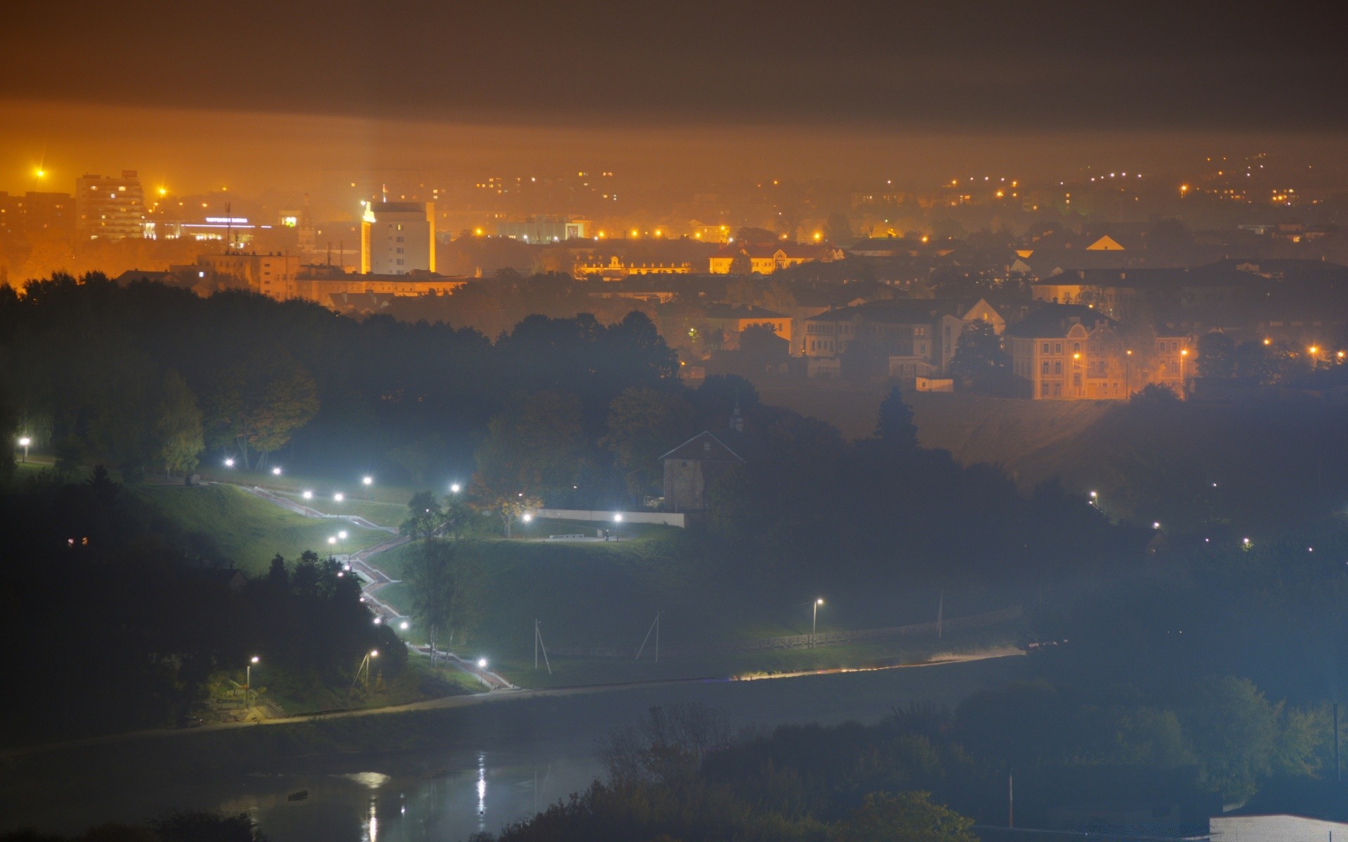 Ciudad de noche rodeada de niebla