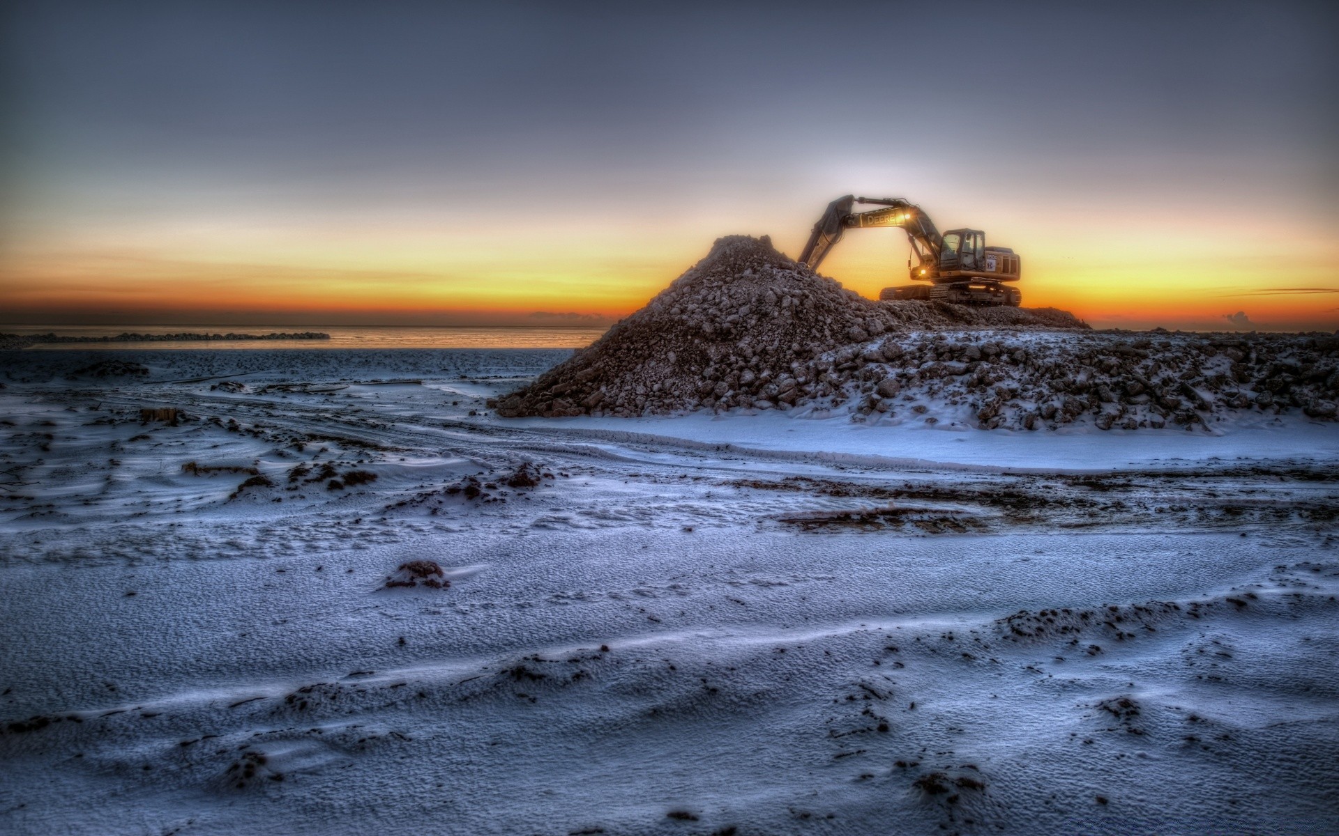 Tractor en el fondo de una puesta de sol amarillo-naranja