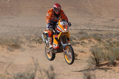 Un atleta en una bicicleta naranja conduce maravillosamente