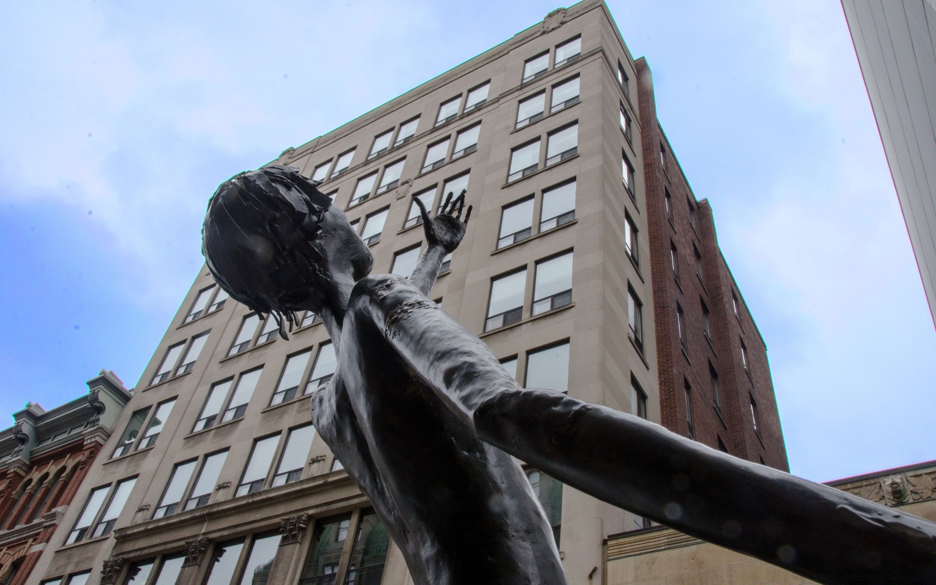 Escultura de un hombre en el fondo de un edificio de gran altura