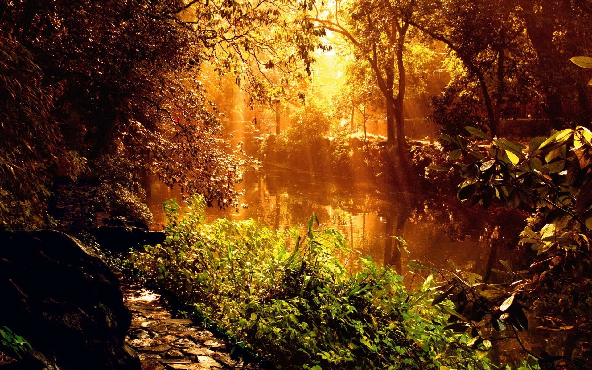 El sol con sus rayos penetra a través del follaje iluminando el río
