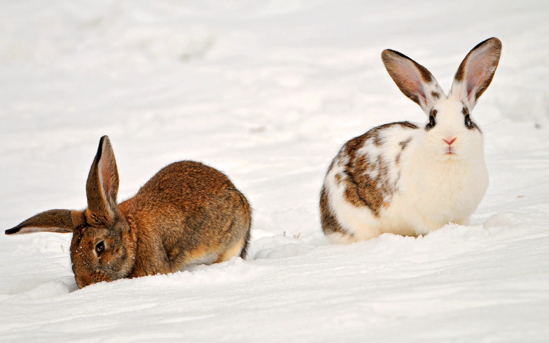 Pelirrojo y blanco liebres en la nieve