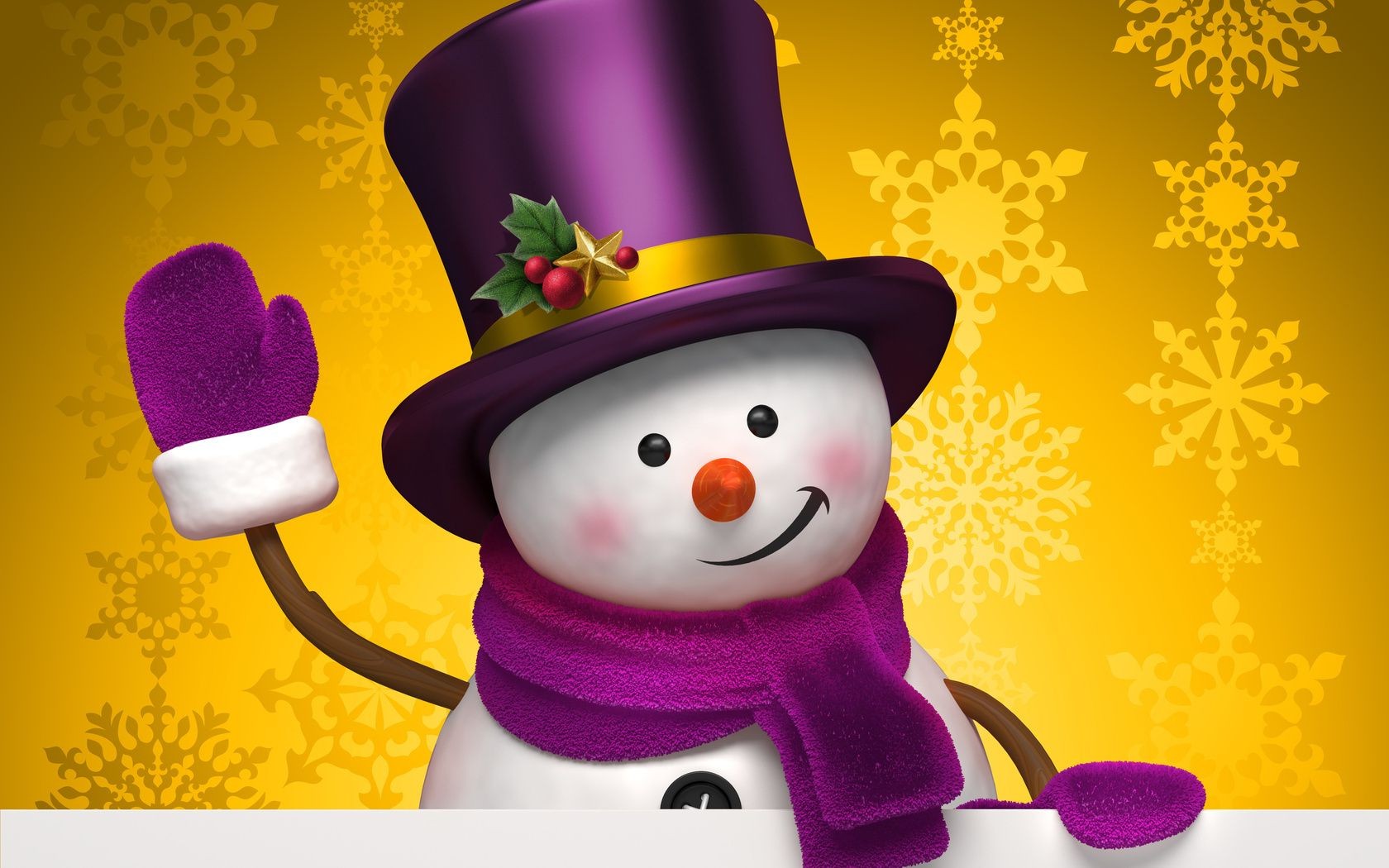 Año Nuevo. El muñeco de nieve sonríe con un sombrero y una bufanda. Muñeco de nieve agitando su mano en un guante