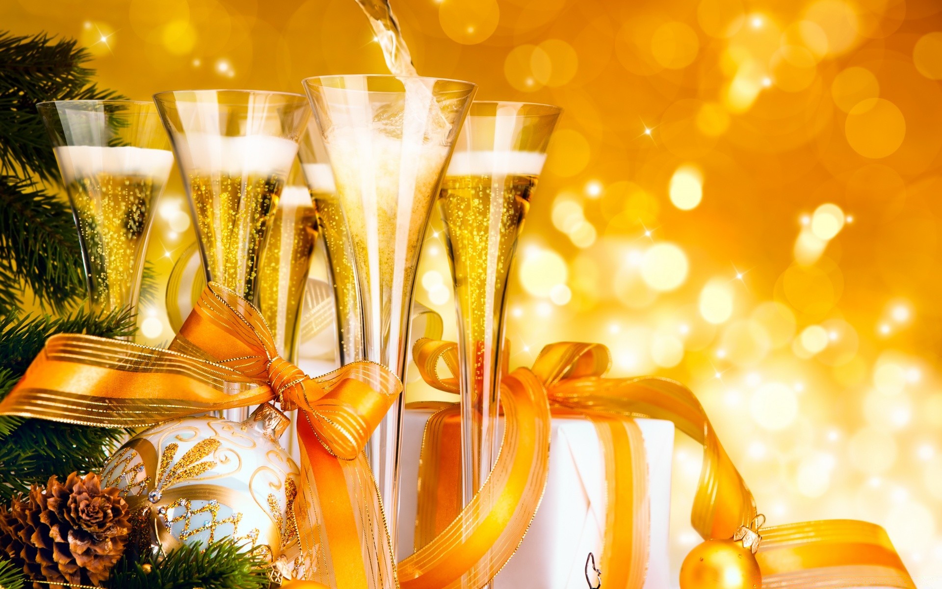 Tarjeta de año nuevo con champán y lazos