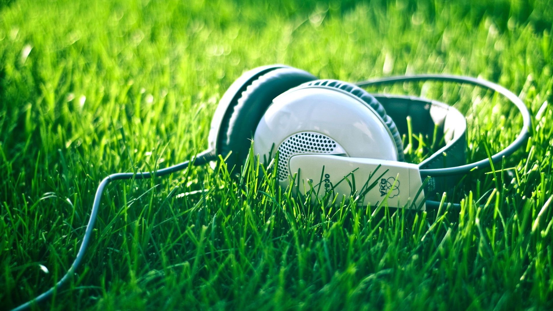 Música en auriculares en el césped verde