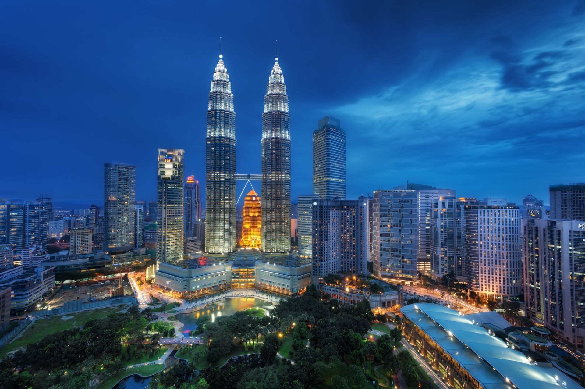 Paisaje nocturno de rascacielos urbanos contra el mar
