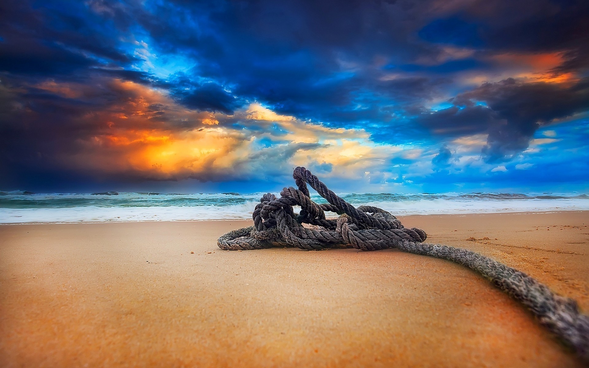 Ancla dejada en la orilla del mar con puesta de solAncla dejada en la orilla del mar con puesta de sol