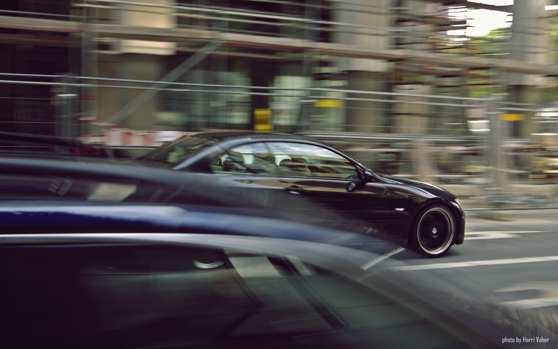 Foto de un coche rápido en el fondo de una imagen borrosa de la ciudad